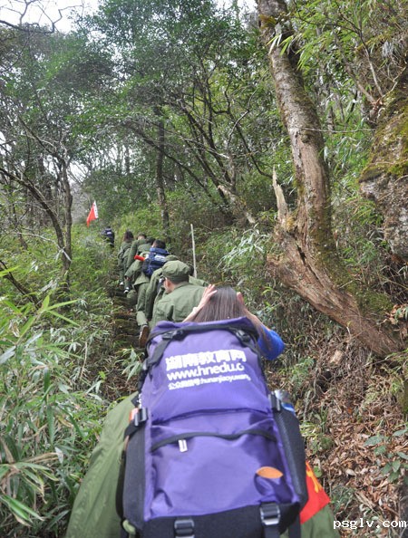 身着军装的城步苗乡干部职工在重走长征路、翻越老山界。杨宗兴摄