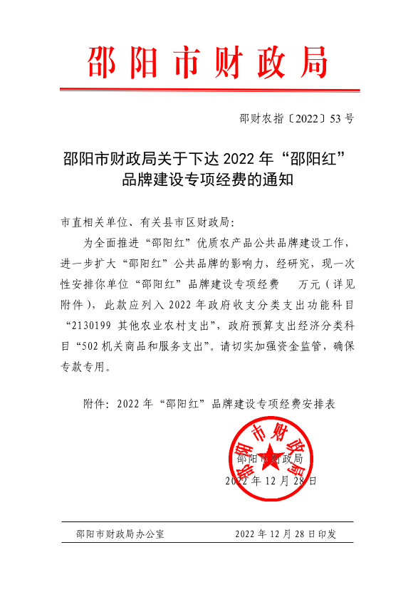 国际米兰百度体育财政局关于下达2022年“邵阳红”品牌建设专项经费的通知