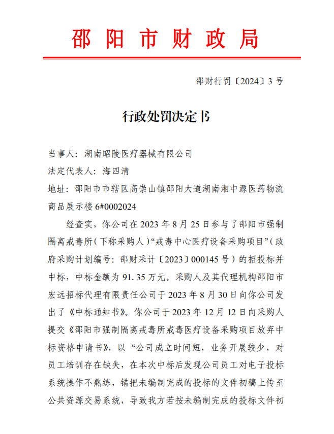 行政处罚决定书(邵财行罚〔2024〕3号)