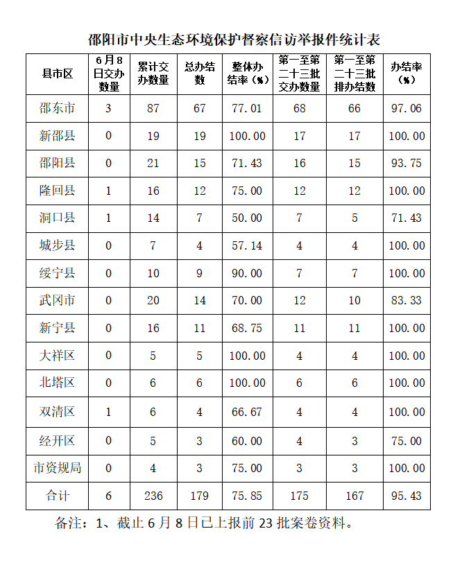 截至到6月8日,全省收到三十批信访件共3656件(长沙1229件、娄底263件、岳阳242件、衡阳241件、邵阳236件、常德215件、湘潭214件、郴州203件、株洲188件、益阳166件、永州152件、怀化129件、张家界98件、湘西州58件、省生态环境厅12件、省自然资源厅5件、省水利厅1件、省住建厅1件、省民政厅1件、省发改委1件、省科技厅1件)。我市236件(其中重点件25件),排全省第5,分别为邵东市87件、邵阳县21件、武冈市20件、新邵县19件、新宁县16件、隆回县16件、洞口县14件、绥宁县10件、城步县7件、双清区6件、北塔区6件、大祥区5件、经开区5件、市自然资源和规划局4件。