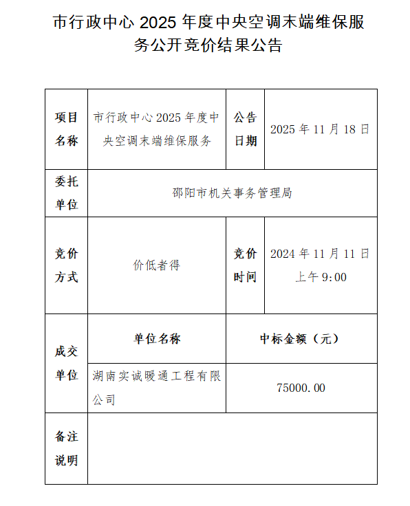 市行政中心2025年度中央空调末端维保服务公开竞价结果公告