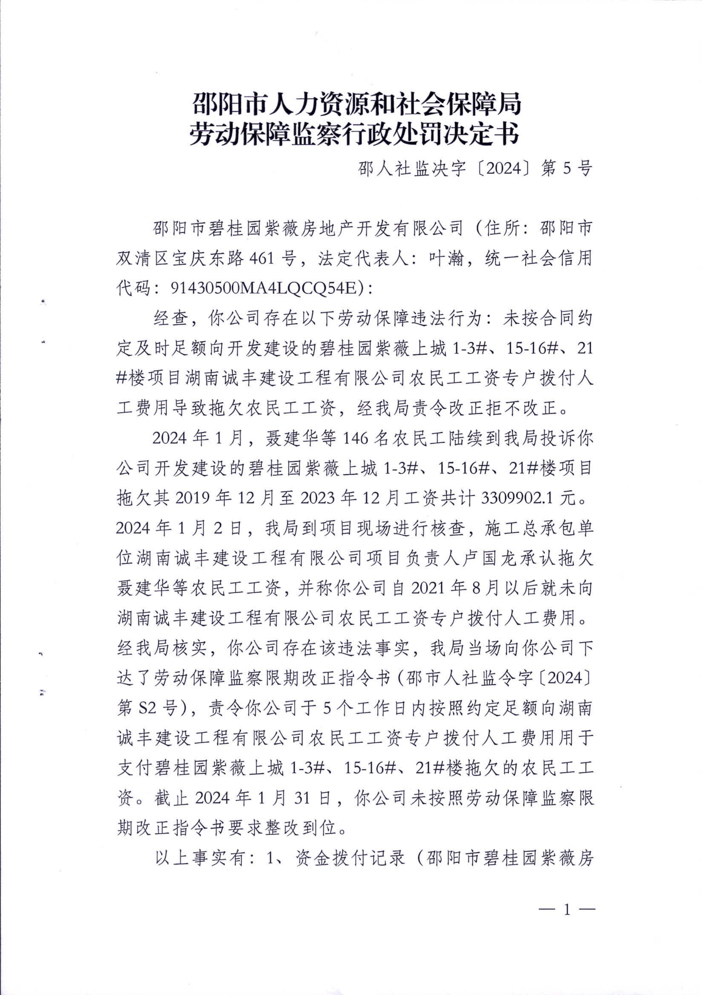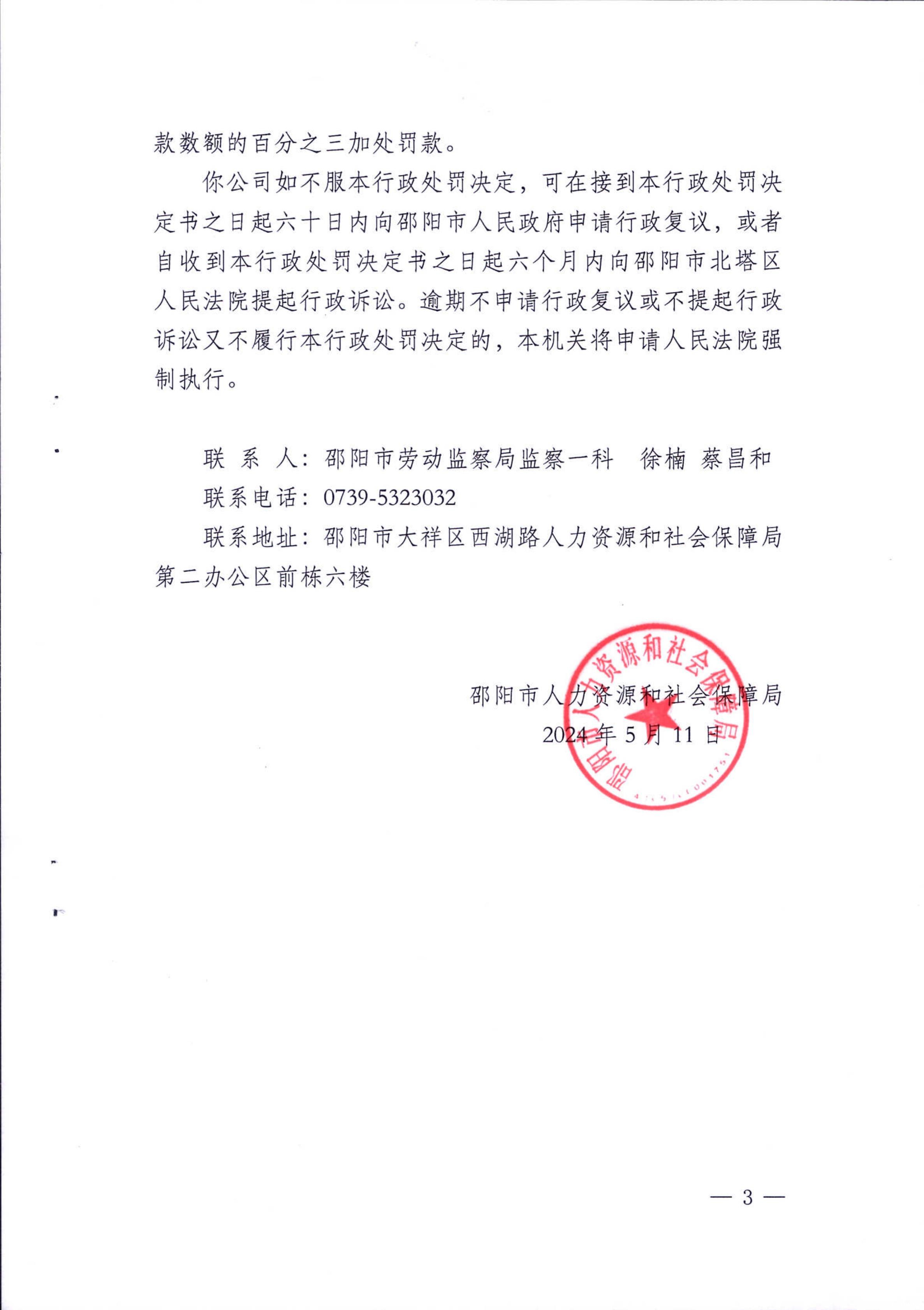 劳动保障监察行政处罚决定书-邵人社监决字〔2024〕第5号