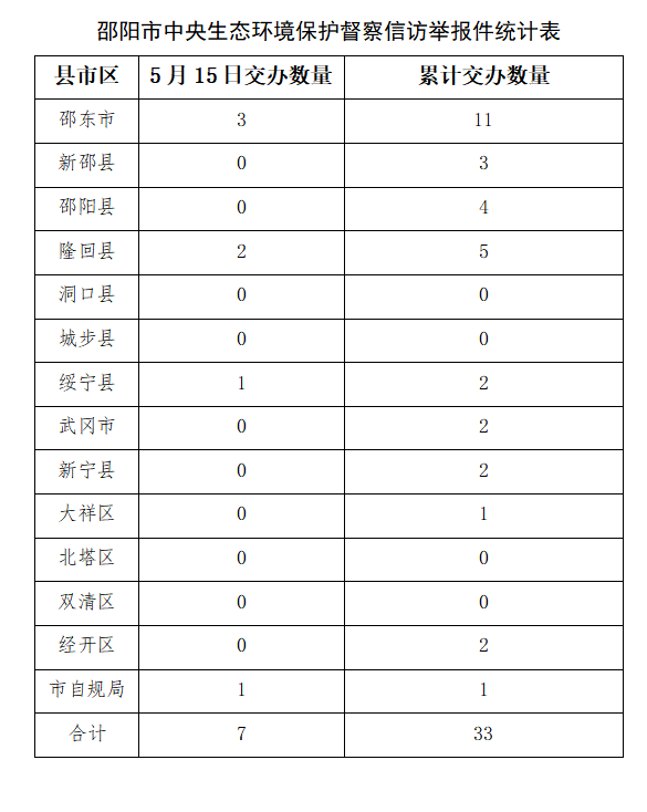 截至到5月15日,全省收到六批信访件共488件(长沙160件、岳阳41件、娄底38件、衡阳34件、邵阳33件、常德33件、湘潭31件、郴州24件、益阳22件、永州18件、株洲16件、张家界14件、怀化14件、湘西州8件、省水利厅1件、省生态环境厅1件)。我市33件,排全省第5,分别为邵东市11件、隆回县5件、邵阳县4件、新邵县3件、绥宁县2件,新宁县2件、武冈市2件、经开区2件、大祥区1件、市自然资源和规划局1件。